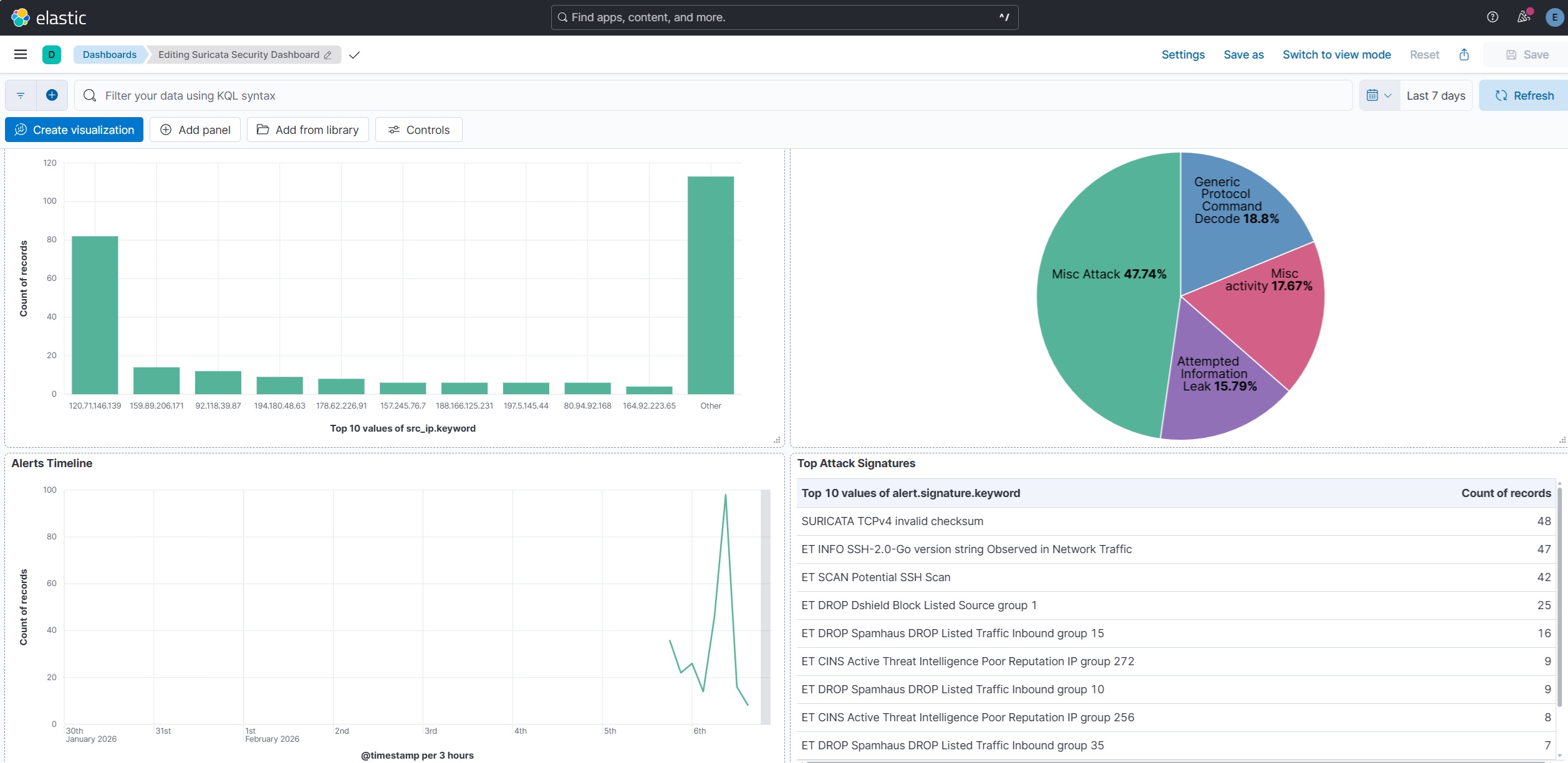 Système de détection d'intrusion avec analyse temps réel des menaces réseau. Architecture hybride AWS/Local avec Suricata, ELK Stack. 20,343 événements capturés, 266 alertes détectées, 20+ IPs malveillantes identifiées.